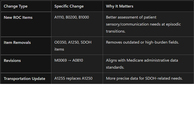 These updates support CMS’s broader effort to align home health data standards with SNFs, IRFs, and LTCHs: